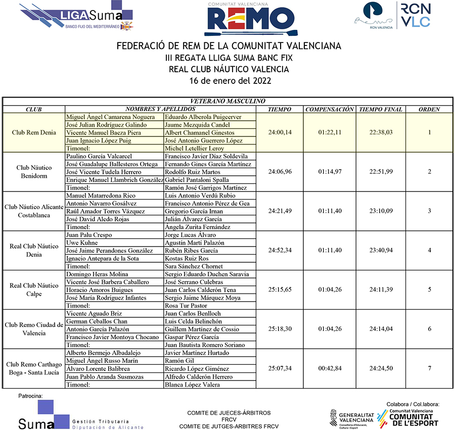 L’equip veterà masculí va fer una regata marcant el ritme a la davantera de totes les embarcacions fent el millor temps real de la regata i deixant molta més distància amb la compensació d’edats, fent un temps final de 22:38.03, pujant així al cim del pòdium.